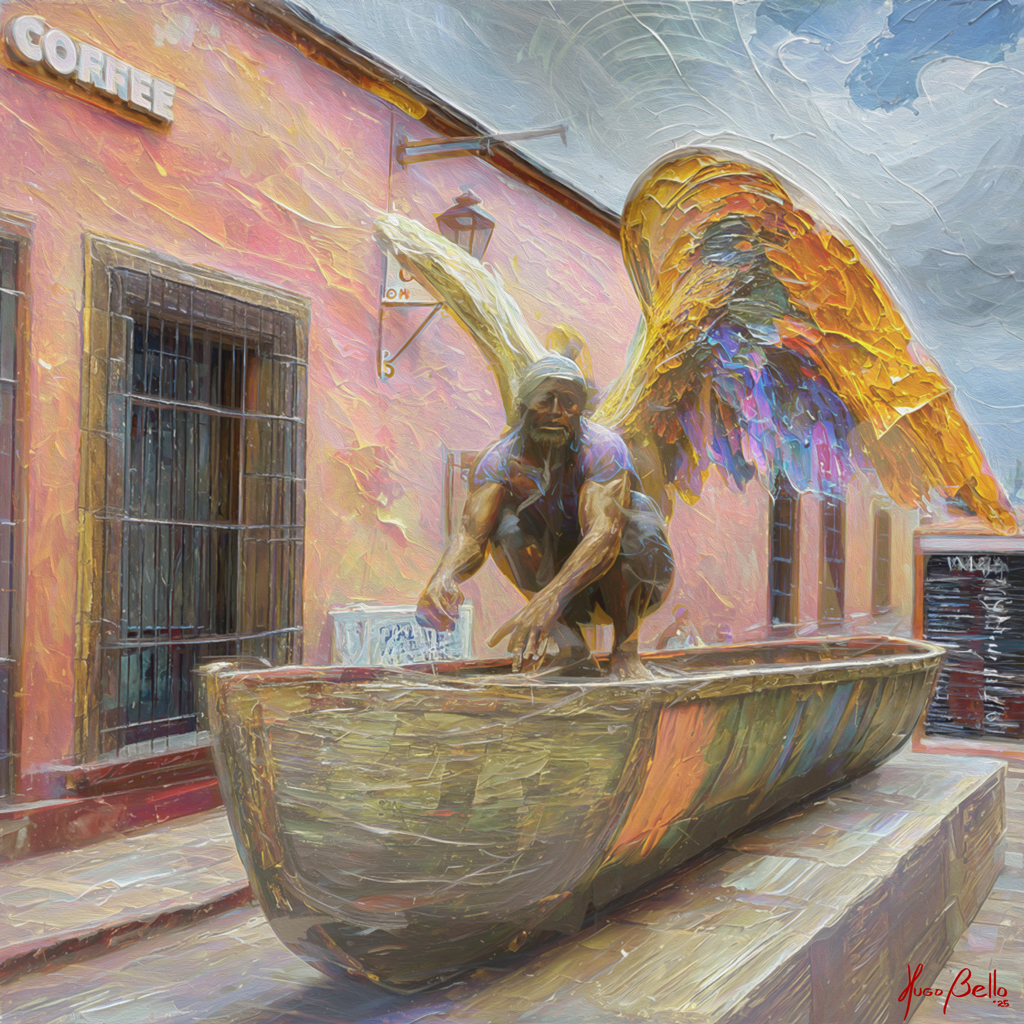 Thanks to David Loit Kestenbaum for staging his wonderful sculpture "Canoe to Heaven" in such a wonderful street that inspired this painting